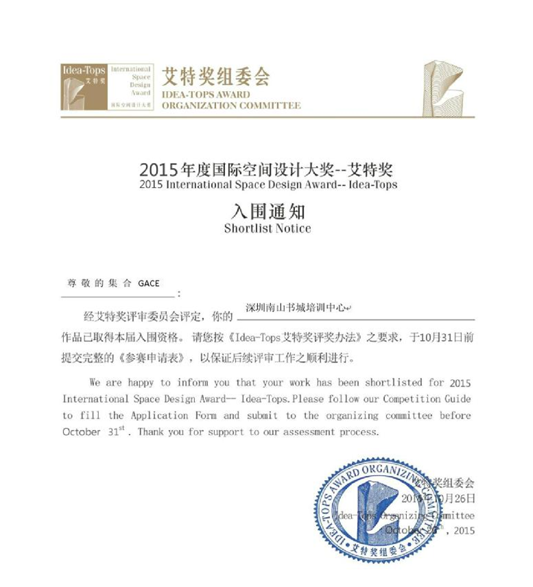國際空間設計大獎——Idopsea-T艾特獎,由中國建筑室內設計行業第一門戶網站——中華室內設計網聯合中國三大權威學術機構——清華大學美術學院、中央美術學院、天津美術學院共同發起主辦,每年一屆,12月隆重頒獎,旨在打造全球最具思想性和影響力的設計大獎,發掘和表彰最佳設計師和最佳設計作品。深圳集合設計作品深圳南山書城培訓中心得到大賽評委們的一致的認可,獲得最佳文化空間設計入圍獎。與諸多國際設計師同行同臺競技,交流設計理念。也是集合設計公司一直熱衷和堅持在做的事情。