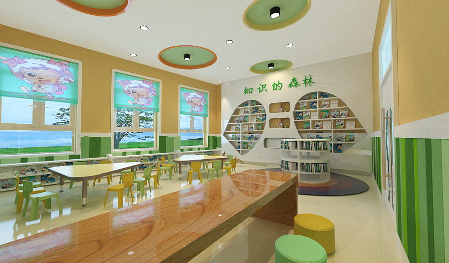 光滑干凈的長(zhǎng)桌設(shè)計(jì)讓孩子們可以在鋪滿陽(yáng)光的桌子上書寫畫畫的,明亮溫馨的環(huán)境孩子們也會(huì)更有學(xué)習(xí)的氛圍,孩子們圍著長(zhǎng)桌一起讀書的畫面,想起來(lái)也是醉了,每個(gè)小細(xì)節(jié)的設(shè)計(jì),卡通圖畫、簡(jiǎn)約大方的書架....每個(gè)角度都是一副唯美的畫面。