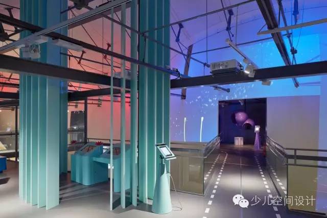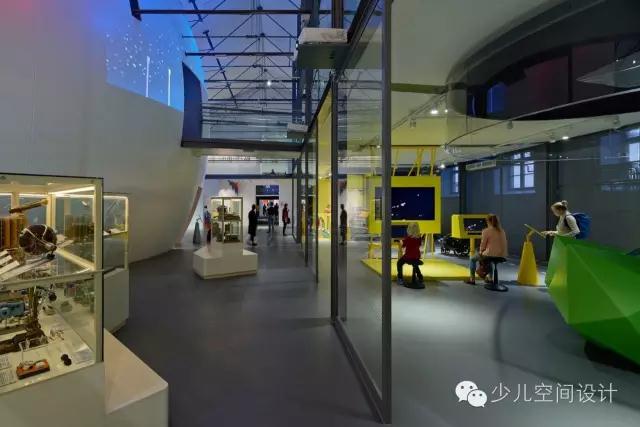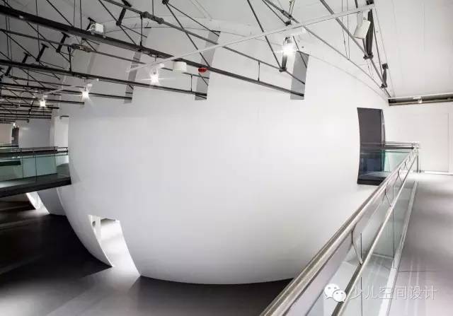 在大廳里,兩個(gè)宏大體量較天花板又上升了10米,一個(gè)體量繃緊而堅(jiān)硬,另一個(gè)體量柔軟而具有波動(dòng)性。它們由橋梁相連,人們通過(guò)橋梁來(lái)回走動(dòng)。游客會(huì)產(chǎn)生“哇”的驚嘆感,并被引入充滿誘惑和想象力的迷人世界,它激發(fā)人們的欲望和好奇心來(lái)參與學(xué)習(xí)、探索和創(chuàng)造的過(guò)程。