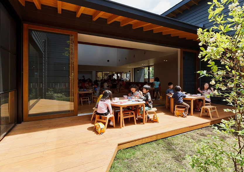 連接建筑物所產生的空間被用作庭院和按不同年齡段分類的花園。計劃中庭院的大小存在適當的距離,使孩子們可以看到同一水平的風景。在兒童衛生間,面對庭院的圖畫書室、餐廳和嬰兒室,可以建立他們在生活中自然地看到彼此的關系。