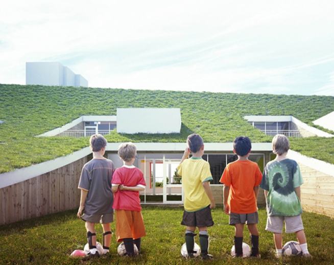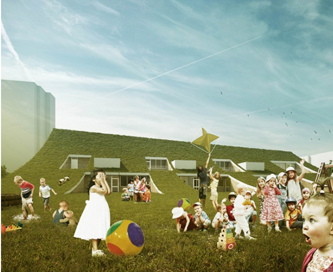 傾斜的屋頂結(jié)構(gòu)是這座建筑最大的特色,它使屋頂和地面的界限變得模糊。傾斜的屋頂煙臺(tái)可以為幼兒園的教室?guī)砀嗟年柟狻T诮值赖娜肟谔帲變簣@的屋頂急劇抬高。在街道上望向幼兒園,像是個(gè)滑梯,很有特點(diǎn)。整個(gè)屋頂是綠色的,給孩子們創(chuàng)造了一個(gè)連續(xù)的活動(dòng)空間。傾斜的屋頂煙臺(tái)也可以為幼兒園的教室?guī)砀嗟年柟狻_@個(gè)設(shè)計(jì)打破了板整的規(guī)則,不去扼殺孩子們愛玩兒的天性,更是為孩子們的學(xué)習(xí)場(chǎng)所增添了許多的夢(mèng)幻元素,符合兒童的心理。