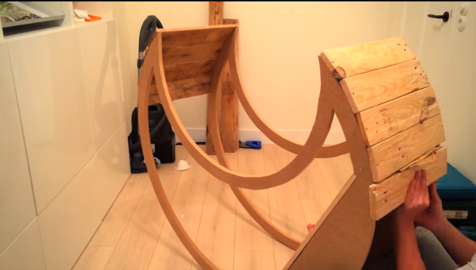 于是這位父親在他休假的時候準備好了木板等材料,規劃出形狀之后就用工具開始切割,就是先裁出一個月亮形的半圓,但是為了結構穩定,沒有徹底切成月亮的形狀。(幼兒園設計)
