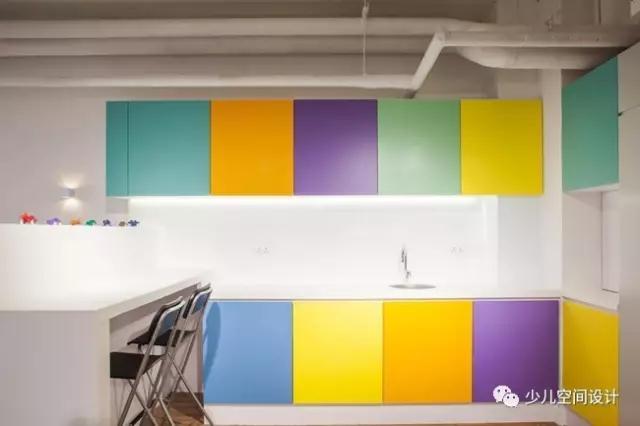 就餐區(qū)和休息區(qū)是專門為家長和老師設(shè)計的兩個區(qū)域,他們可以在這里交流溝通孩子的情況。就餐區(qū)在功能上是一個帶有多重色彩櫥柜的敞開式廚房,它這樣的設(shè)計還可以激發(fā)孩子的興趣以及異想天開的想象力。就餐區(qū)的顏色都源自Babysteps的標識中相同的色調(diào),與幼兒樂園整體的設(shè)計在視覺上形成統(tǒng)一,同時它也與整個室內(nèi)空間微妙的單色調(diào)相互協(xié)調(diào)。
