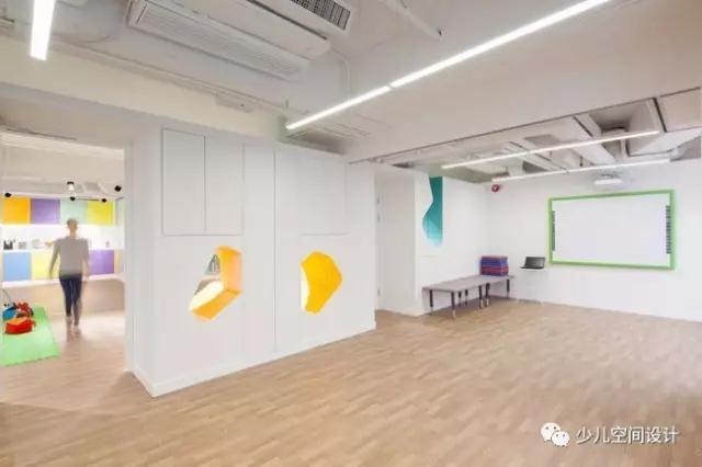 探索和運動區(qū)是幼兒樂園的重點區(qū)域。幼兒園室內(nèi)設(shè)計 在這個開放式的,明亮而怡人的活動區(qū),可以容納多種運動方式:純粹運動的方式、感知觸覺的方式、還有安靜的方式。一面帶有幾何圖案的彩色墻壁極具特色,這堵墻圍成了一個儲存區(qū)角,并且自然而然地將活動區(qū)內(nèi)不同方式的運動區(qū)分割開來。進一步來說,這種分割還可以讓孩子和家長通過墻上幾何圖案的窗框看到教室里面的情景。