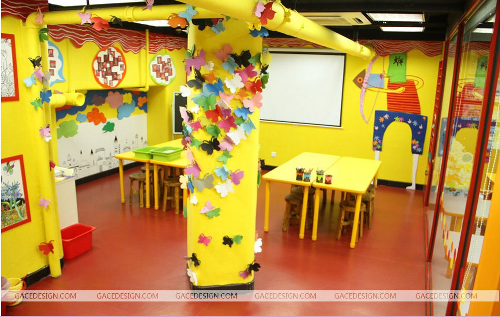 幼教中心設計裝修地面要經過嚴格的除潮處理,教室地面一定要處理不滑、不澀。地熱式供熱的教室是最好的,寶寶很多時間是在地面上玩耍、學習。如果是立式供暖外觀一定要用保護層和外面隔離,教室內1.00米高度以下全部用軟墊保護起來,這樣可以給寶寶更大的空間。選擇PVC地板、橡膠地板及亞麻地板,這樣的地面既適合寶寶在上面游戲學習,又好清理。其次是木地板,地板雖適合寶寶在上面爬、坐、玩,但是地板的硬度比較大,對寶寶那細嫩的皮膚容易產生磨擦危害;其次是成塊的軟墊,還有方形的泡沫軟墊,教室要配備較多的鞋柜、儲物柜、掛衣架,寶寶來了以后就可以輕松的到親子園里學習、游戲。