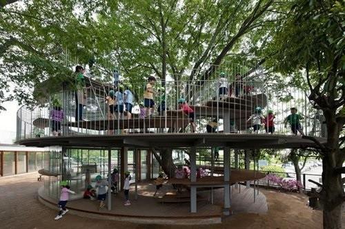 半暴露的結(jié)構(gòu)被中心樹木巨大的枝葉覆蓋。建筑內(nèi)部高5米,這個開放的巨大“樹屋”中有許多壓縮和封閉的空間,只有半蹲、爬行的小朋友才能通過。為了保護小朋友,建筑師沒有設(shè)計過多欄桿,而是在地面上覆蓋了一層橡膠墊,以減輕意外磕碰。